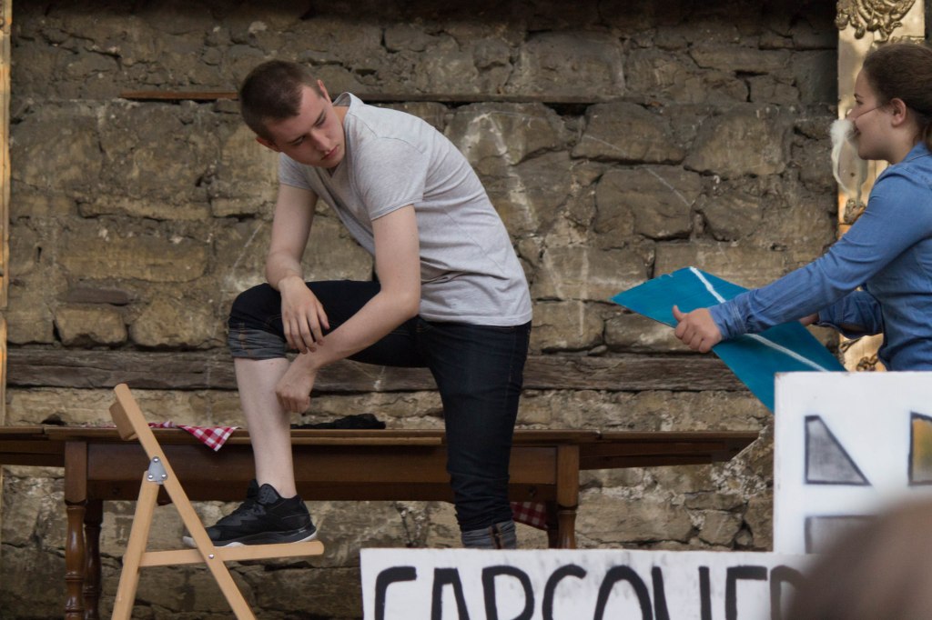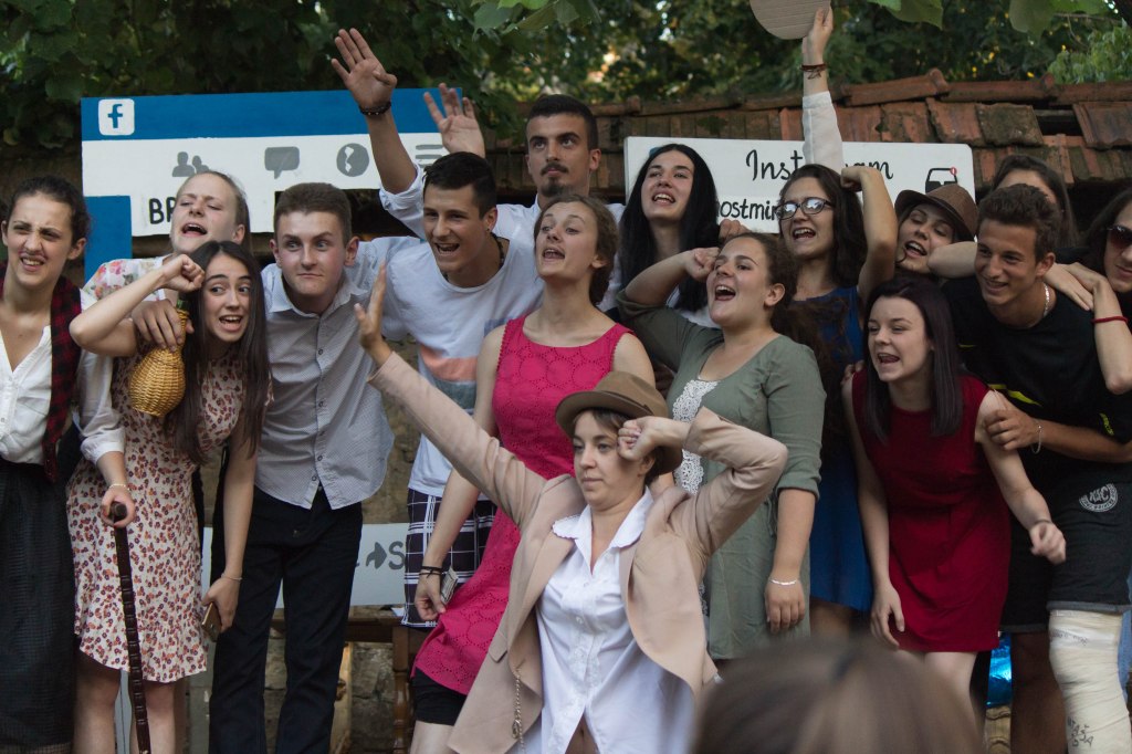 The theater troupe each year includes Bosniak and Serb high school students. The summer 2017 troupe performed their original tale of four generations of a Bosnian family in Prijedor, Mostar and Jablanica. By the time their final performance in Banja Luka came around, they were confident and relaxed with one another. A girl walked past 17-year-old Luka, tossing a bundle at him with a laugh and a quick joke in Bosnian. Turning to me with a raised eyebrow and a crooked smile, he unfolded the mini skirt and explained, “They want me to wear this.”