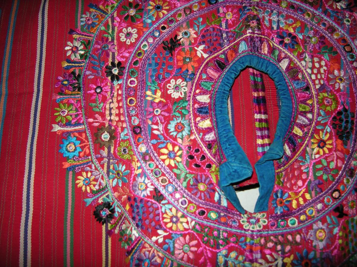 Embroidery surrounds the collar of a traditional Maya shirt.